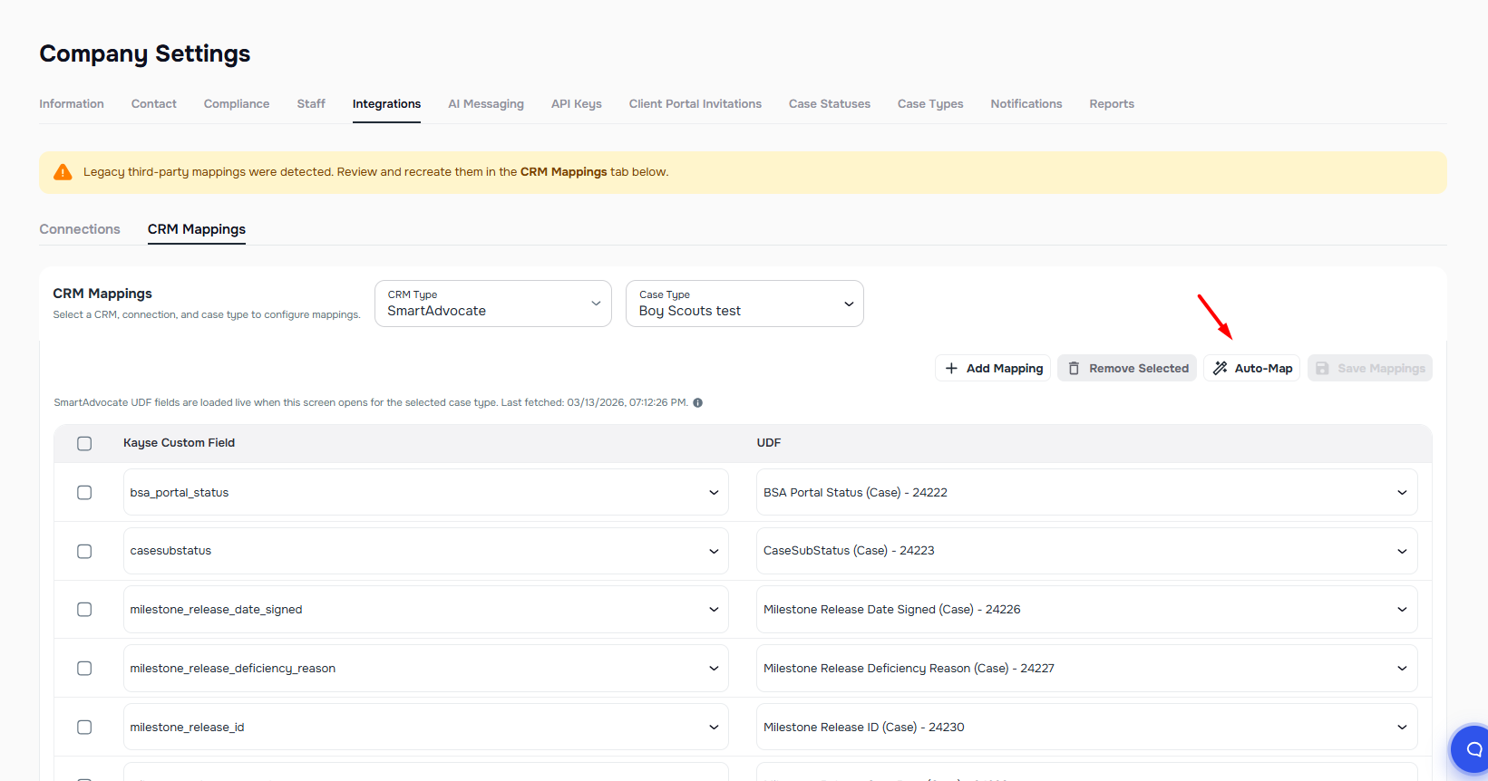 Auto-Map button - run automatic matching from Company Settings > Integrations > CRM Mappings