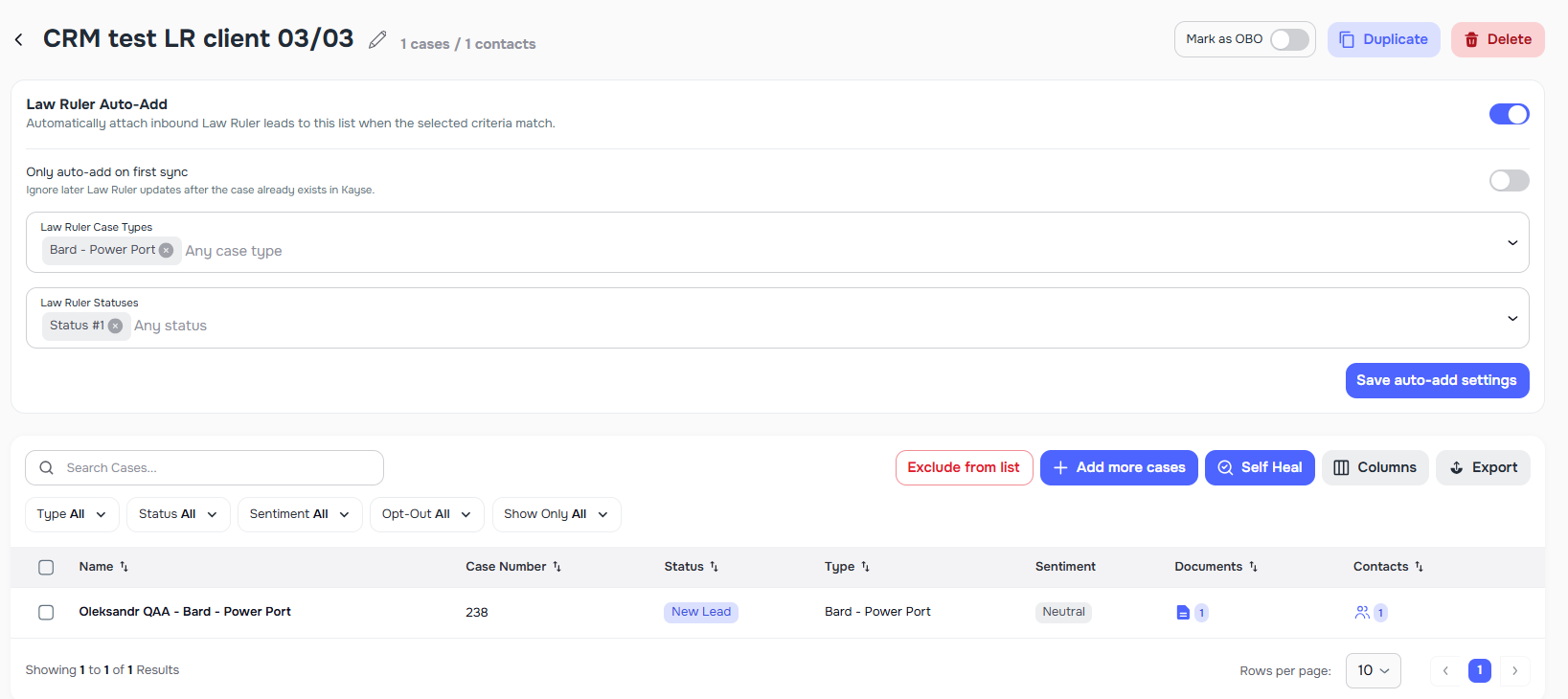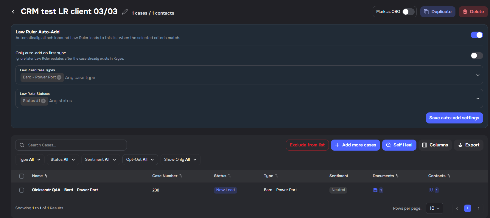 Auto-add on lead create/update — enable auto-add on any case list to automatically add LawRuler leads that match the configured criteria when they are created or synced
