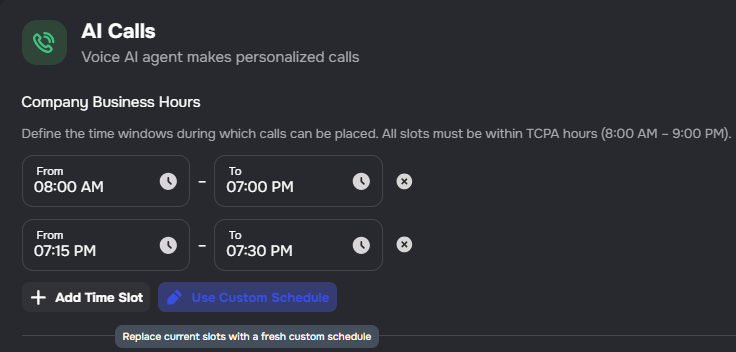 Business hour slots display — when using business hours mode, the specific time slots are shown in the campaign details