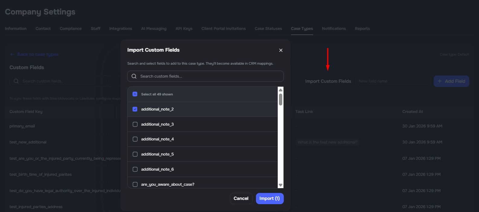 Import existing fields - add one or more existing company custom fields to the selected case type