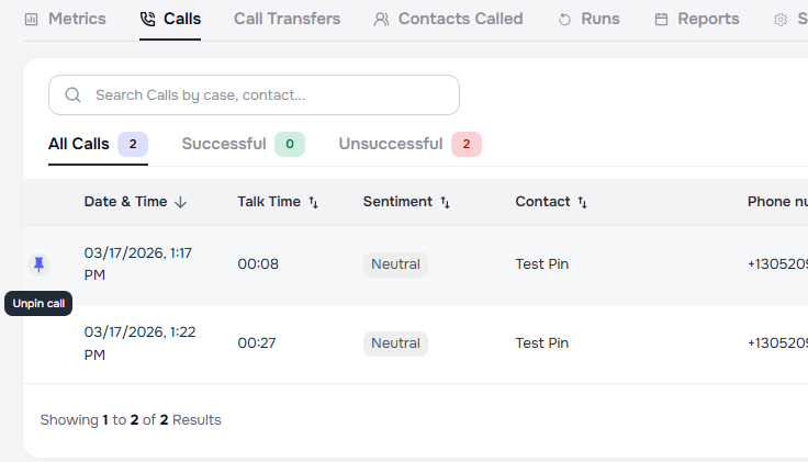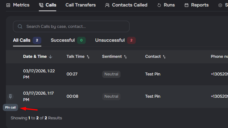 You can now pin important calls within an AI campaign's call list so they're easy to find later.