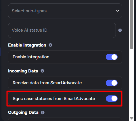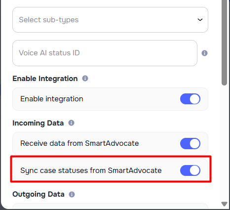 A new toggle in the Smart Advocate integration settings lets admins automatically keep case statuses in sync from Smart Advocate to Kayse.