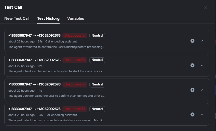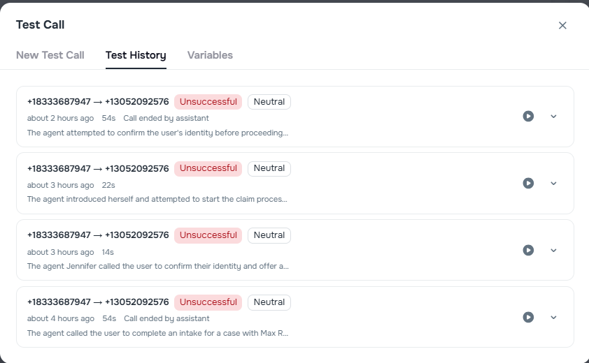 Transcript history — view a list of previous test calls with timestamps and outcomes