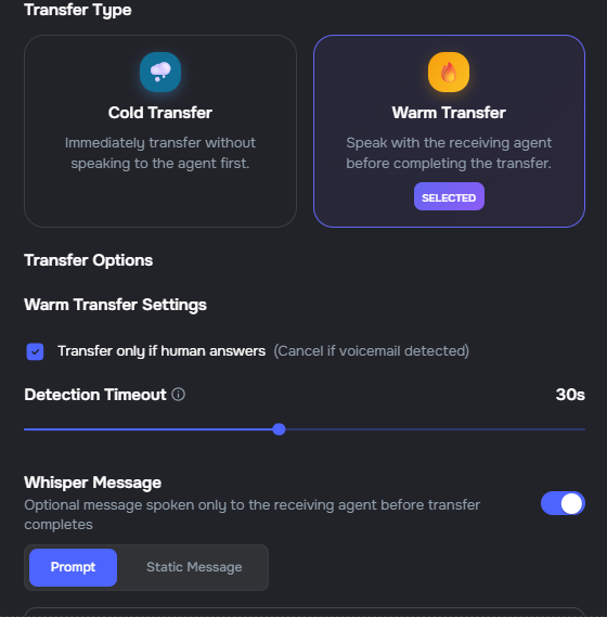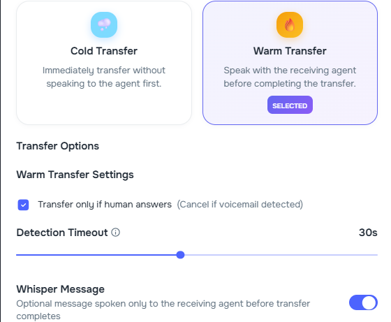 The call transfer configuration in the agent builder has been simplified to focus on the most impactful settings.